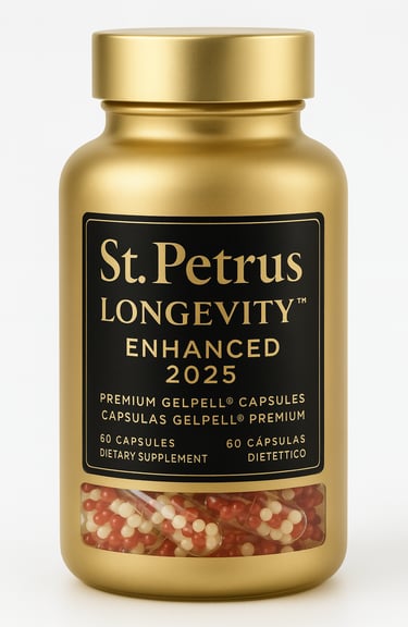 La fórmula actual de St. Petrus Longevity™ Enhanced 2025 se convierte en una sinfonía celular de precisión científica.